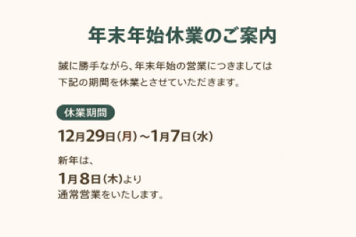 12月29日(月)~1月7日(水) までお休みをいただき、